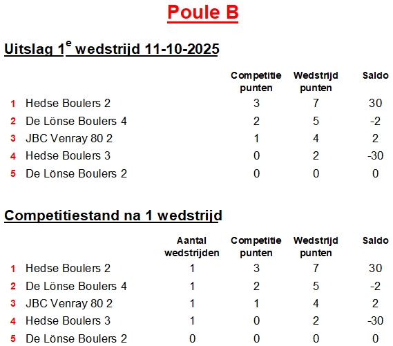 Eerst volgende wedstrijd is op zaterdag 25-10-2025, Poule A.